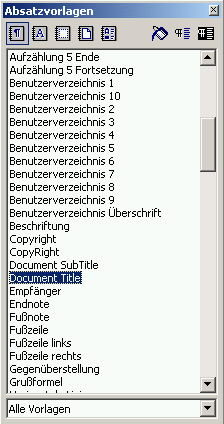 Es gibt eine Dokumentenvorlage, die alle derzeit unterstützten Benutzervorlagen enthält. Laden Sie die Vorlage DocBookTemplate.stw, damit alle von DocBook benötigten Vorlagen zur Verfügung stehen. Öffnen Sie den Stylisten mit <F11> und wählen Sie „Alle“, damit Sie alle vorhanden Vorlagen sehen können.