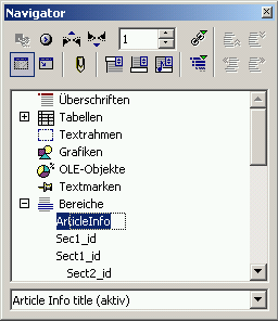 Wenn Sie sehen möchten, wie Bereiche verbunden sind, dann öffnen Sie mit <F5> den Navigator. Klappen Sie das Bereichs-Tag, um das Layout der Bereiche dieses Dokuments darzustellen. Sie können zum Anfang eines bestimmten Bereichs springen, indem Sie ihn im Navigator doppelklicken.